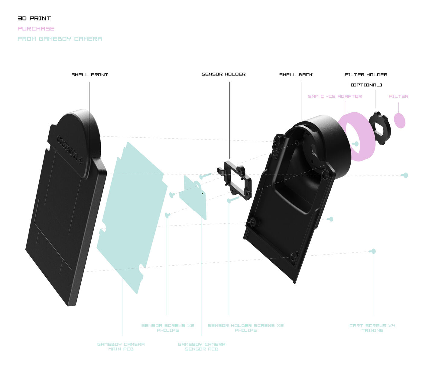A Gameboy Camera custom shell designed for the retro Nintendo fan who wants to dabble a little more with their Gameboy photography.Specifically developed to be a straight forward modification, it allows the use of CS lenses which are conveniently sized for the form factor of the Gameboy.Additionally, using a CS lens adaptor, other full size lenses can be fitted if you want to take things even further than Nintendo ever imagined.Scroll for more info or...
